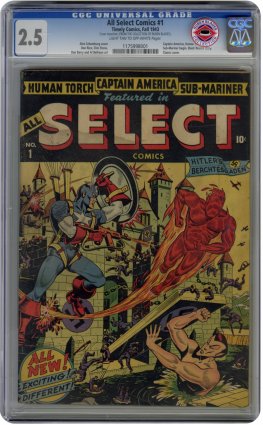 off-white pages; Sl (C-1) small amount of color touch, small amount of glue, right edge trimmed classic Human Torch/Sub-Mariner/Capt. America; Alex Schomburg cover (Fall 1943)