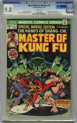 white pages 1st app of Shang-Chi, Fu Manchu & Sir Denis Nayland Smith; Jim Starlin & Al Milgrom cover/art; 1st app/death of Dr. James Petrie QES: Certified - criteria given: perfect staple placement + perfect spine + perfect cover edges + deep color strike