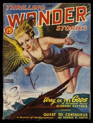 April 1938. Cover by H. W. Wesso. Stories by Henry Kuttner, Clark Ashton Smith, Jack Williamson, John Russell Fearn, Edmond Hamilton, Clyde Wilson, Manly Wade Wellman, and Will Garth. glossy! ow/white pages