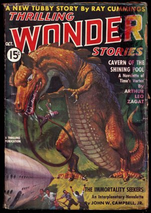 August 1937. Stories by Eando Binder, John W. Campbell Jr., Paul Ernst, Otis Adelbert Kline, Edmond Hamilton, J. Harvey Haggard, Gordon A. Giles, and S.K. Bernfeld. "Zarnak" comic story by Max Plaisted. taped spine