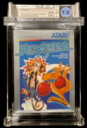 A Seal Rating; First-Party V-Overlap Seam; 1983; Silver Box; Locking Tab Lid; Made in USA; Atari Hologram Sticker. Cover Artist: Mart Viljamaa; Port of the 1982 Sun Electronics arcade game
