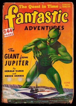 June 1942. Harryhausen-esque scg-fi cover by Malcolm Smith. Stories by William P. McGivern & David Wright O'Brien -as (Gerald Vance & Bruce Dennis) "The Giant from Jupiter", David Wright O'Brien (as "Duncan Farnsworth"), Stanton A. Coblentz, David Wright
