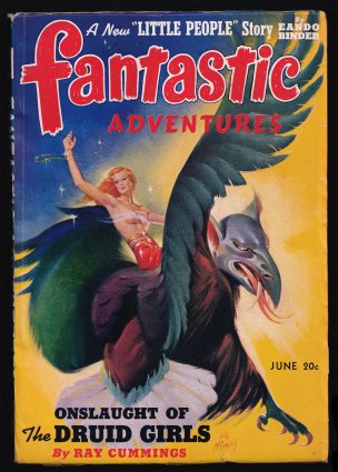 June, 1941. Cover by Harold W. McCauley. Science Fiction and Adventures magazine. Features a new"Little People" story by Eando Binder, and "the Onlsaught of the Druid Girls" by Ray Cummings. Softcover Pulp, 7-in x 9 1/2-in, 146 Pages, B&W. Cover price $0. great eye appeal