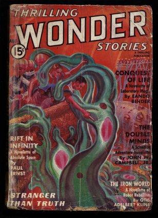 August 1937. Stories by Eando Binder, John W. Campbell Jr., Paul Ernst, Otis Adelbert Kline, Edmond Hamilton, J. Harvey Haggard, Gordon A. Giles, and S.K. Bernfeld. "Zarnak" comic story by Max Plaisted. taped spine