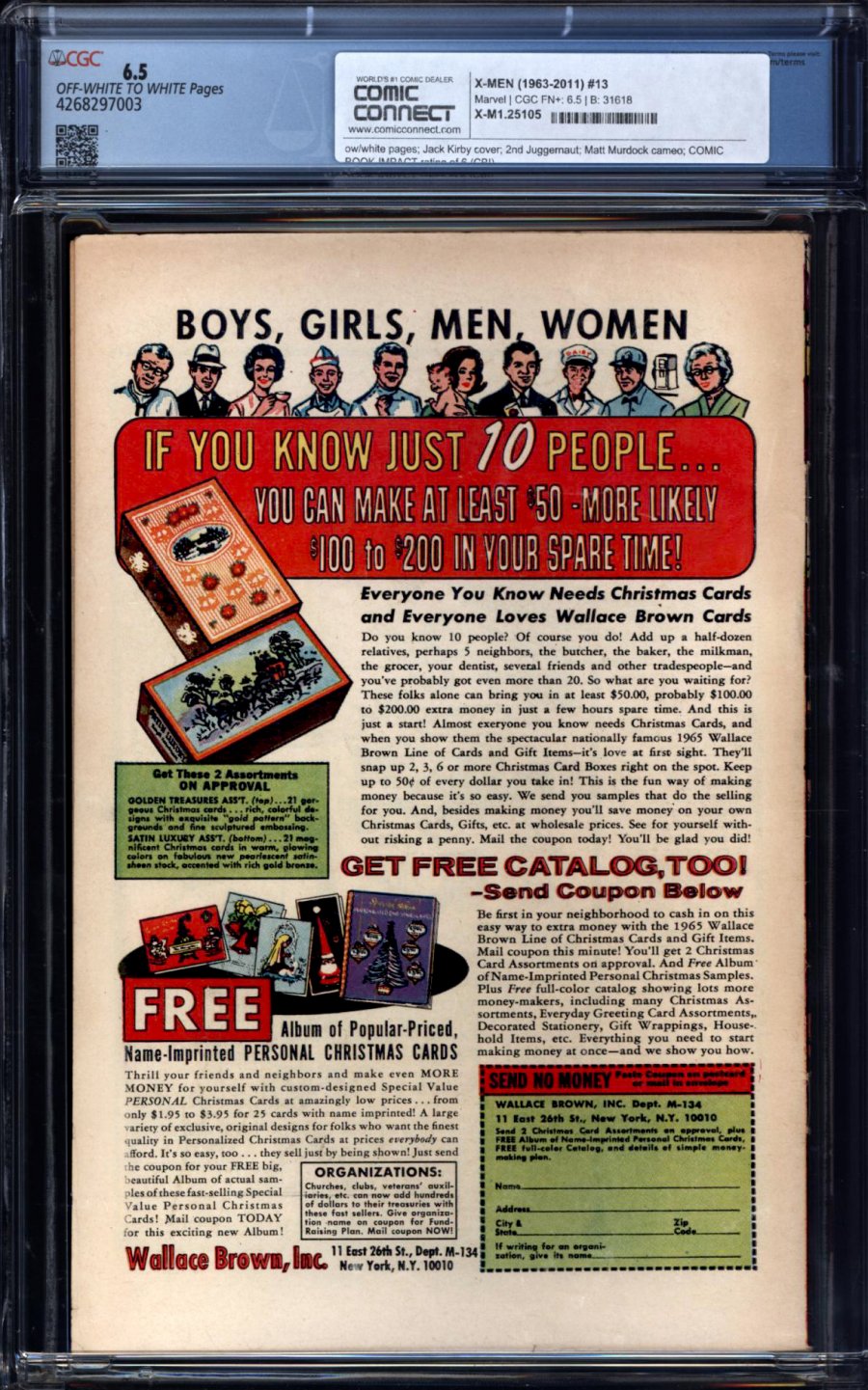 Jack Kirby cover; 2nd Juggernaut; Matt Murdock cameo; COMIC BOOK IMPACT rating of 6 (CBI)Continuing the saga of the introduction of Charles Xavier's brother, the Juggernaut, this issue is basically a nonstop action-fest, an all-out melee between the X-Men and the brutal Juggernaut, whose helmet protects him from Professor X's mental powers. Calling on help from other heroes nearby, the Human Torch shows up in the nick of time to help the exhausted mutants, and they finally manage to subdue their enormous foe. Jean Grey tends to her battered and bruised compatriots after the battle, much to their pleasure. Featuring pencils by Kirby and Jay Gavin and inks by Joe Sinnott, this classic issue is a popular book with X-fans of all ages.
