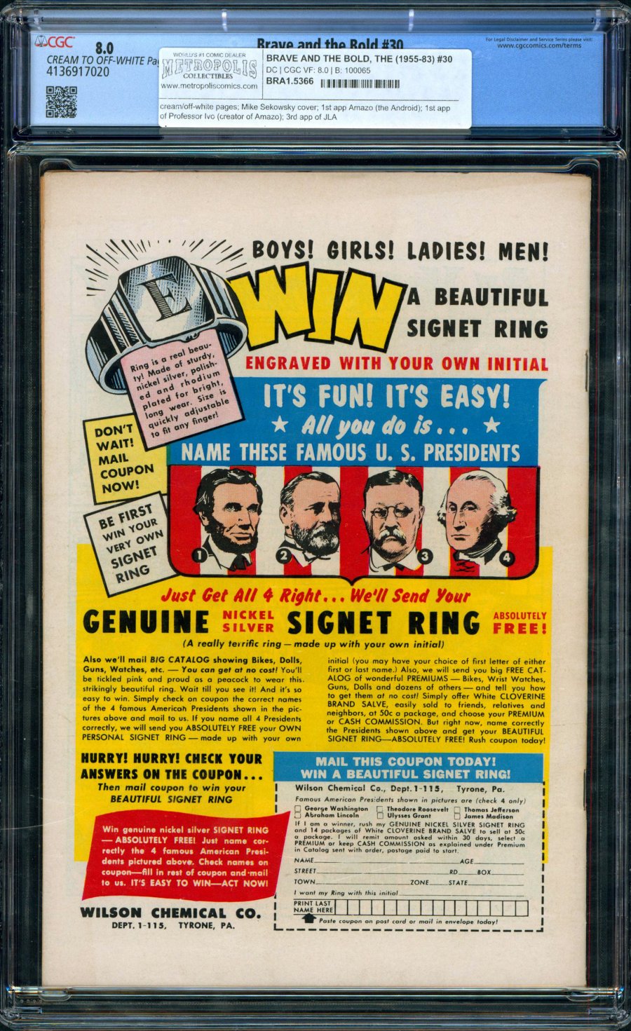 3rd app of JLA; 1st app Amazo (the Android); 1st app of Professor Ivo (creator of Amazo); COMIC BOOK IMPACT rating of 7 (CBI)