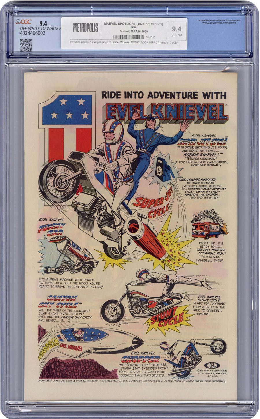 Marvel Spotlight #32 features the origin and first appearance of Spider-Woman (no relation). Originally created by writer Archie Goodwin as a one-off character, the issue did surprisingly well and writer Marv Wolfman was tasked to take on the new heroine. Wolfman gave Spider-Woman the alter-ego of Jessica Drew, a combination of his daughter’s first name and the last name of fictional detective Nancy Drew. Her second appearance saw a retcon of her origin to that more of a traditional super-hero, as she took on the nefarious Hydra. Fluctuating sales and creative differences led to the writers killing Spider-Woman off after a fifty-issue run, upsetting fans around the world. Although she was later resurrected, Spider-Woman's appearances in comics would be scarce for the next 10 years, often not even in costume. The year 2005 saw a major revival of the character when writer Brian Michael Bendis featured Spider-Woman as a member of "the New Avengers,” where she would become prominent in comics for the next decade and a key figure for 2009's Secret Invasion storyline. Due to her major resurgence, a solo series for the character was in high demand, and she was ranked #20 in IGN's Top 50 Avengers even after being a member for just over a decade. Although she shares no connection in origin or powers to Marvel’s most popular web-slinger, Spider-Woman has teamed up with Spider-Man on many occasions and there are plans to feature her in the sequel to 2018's highly praised "Into the Spider-Verse.” With the MCU gearing up for the movie adaption of the Secret Invasion storyline, Spider-Woman is likely going to become a household name in the next few years, driving up the value of her first appearance for collectors and aficionados alike.