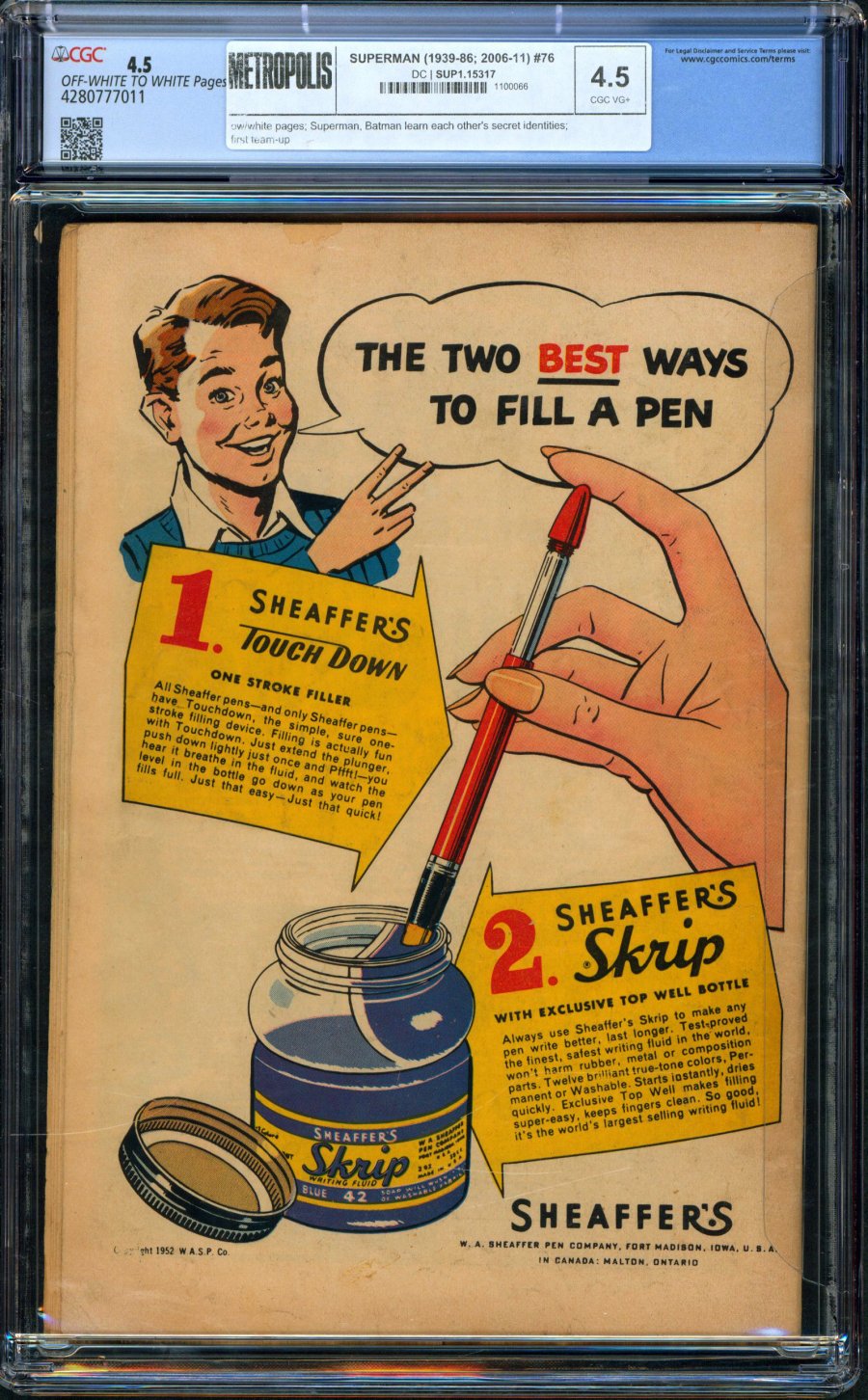 Superman, Batman learn each other's secret identities; first team-up; COMIC BOOK BOOK IMPACT rating of 7 (CBI)Cover art by Win Mortimer. The Mightiest Team in the World!, script by Edmond Hamilton, pencils by Curt Swan, inks by Stan Kaye (pages 1-8) and John Fischetti (pages 9-12); Superman and Batman learn each other's secret identities [for the first time] when they meet on a cruise while trying to find a diamond thief. The Misfit Manhunter starring Superman, Joe Harris, and Frosty Ferris, script by Bill Finger, pencils by Wayne Boring, inks by Stan Kaye. The Gatling Gun text story by Ben Galloway. Mrs. Superman, script by Bill Woolfolk, art by Al Plastino.