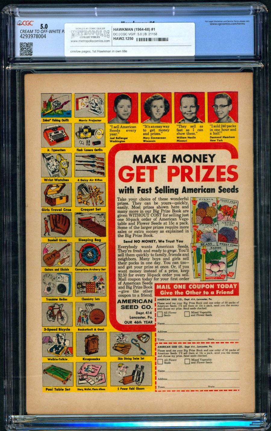 1st Hawkman in own title; COMIC BOOK IMPACT rating of 7 (CBI)After his premiere appearance in Flash Comics #1, Hawkman reemerged in the Silver Age in his own self-titled series. Though there were many iterations of the character, the version that appears in this series is Carter Hall, arguably the most popular Hawkman. Hall is a modern-day archeologist who is the reincarnation of an ancient Egyptian prince who restored the memories of his former life after discovering an ancient magical dagger. Hall dons a legendary artifact, the winged Nth metal armor, to battle an evil priest who was his arch-rival in the past that followed him into the present, thus, becoming Hawkman for the first time. The character has gone on to flourish within the DC Universe joining multiple superhero teams, and even becoming a lead member of the Justice Society of America as well as a staple of the Justice League. However, don't let the angelic wings fool you, as a character Hawkman is savagely short-tempered which was in no small part responsible for accumulating his devoted following. In later issues Hawkman’s origin story was retconned to allow him to become part of a larger Hawkworld known as Thanagar, but still retain some elements of his ancient Egyptian roots, this modernized version of Hawkman is now recognized as one of DC's most well-received titles. With the number of appearances outside of comics growing, Hawkman’s fan base expands more and more with each passing year, making this a popular first issue collectible.