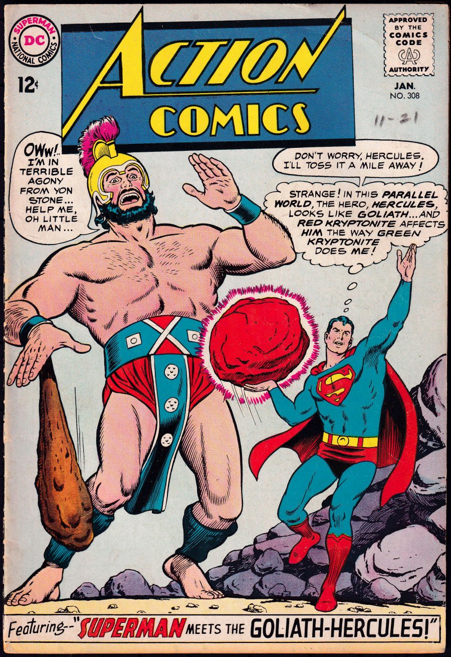 Curt Swan red Kryptonite cvr; COMIC BOOK IMPACT rating of 5 (CBI)Cover pencils by Curt Swan, inks by George Klein. "Superman Meets the Goliath-Hercules!", art by Al Plastino; A lightning bolt throws Superman into a parallel world, where he helps Hercules (who looks like Goliath) to perform a set of impossible tasks. The Untold Stories of Superman ad. "The Super-Tot from Nowhere!", script by Leo Dorfman, art by Jim Mooney; Supergirl finds a young girl with super-powers and takes her home until she can find where she came from and who her parents are.