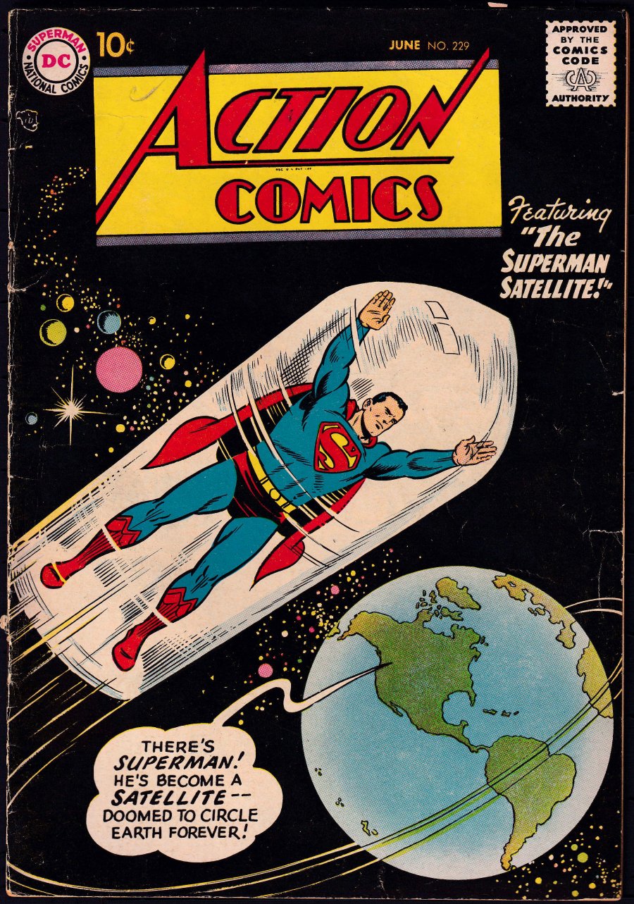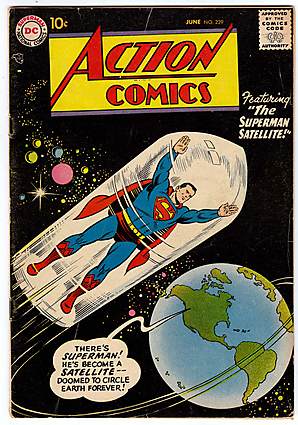 Plastino outer space coverCover by Al Plastino. "The Superman Satellite," script by Edmond Hamilton, pencils by Wayne Boring, inks by Stan Kaye; After destroying an asteroid in space, Superman is informed that he has become poisonous and that he must never touch the Earth again. "The Great Jungle Swindle" starring Congo Bill and Janu the Jungle Boy, script by Jack Miller, art by Nick Cardy. Half-page Varsity Vic story by Henry Boltinoff. Games That Save Lives article. "The Milky Way Hunt," script by Otto Binder, art by Jim Mooney.