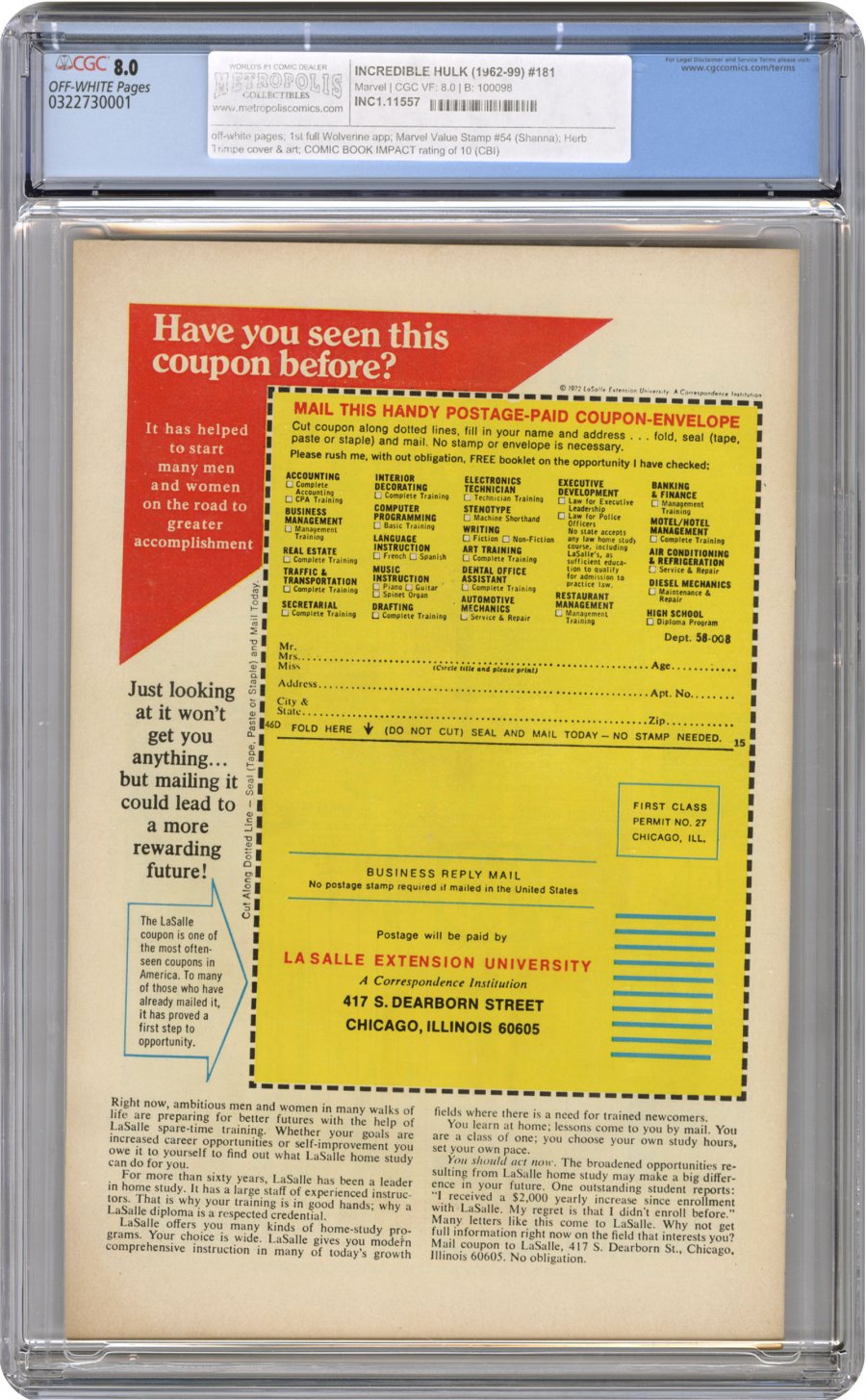 1st appearance of Wolverine (full); Marvel Value Stamp #54 (Shanna); Trimpe cover & art; COMIC BOOK IMPACT rating of 10 (CBI)