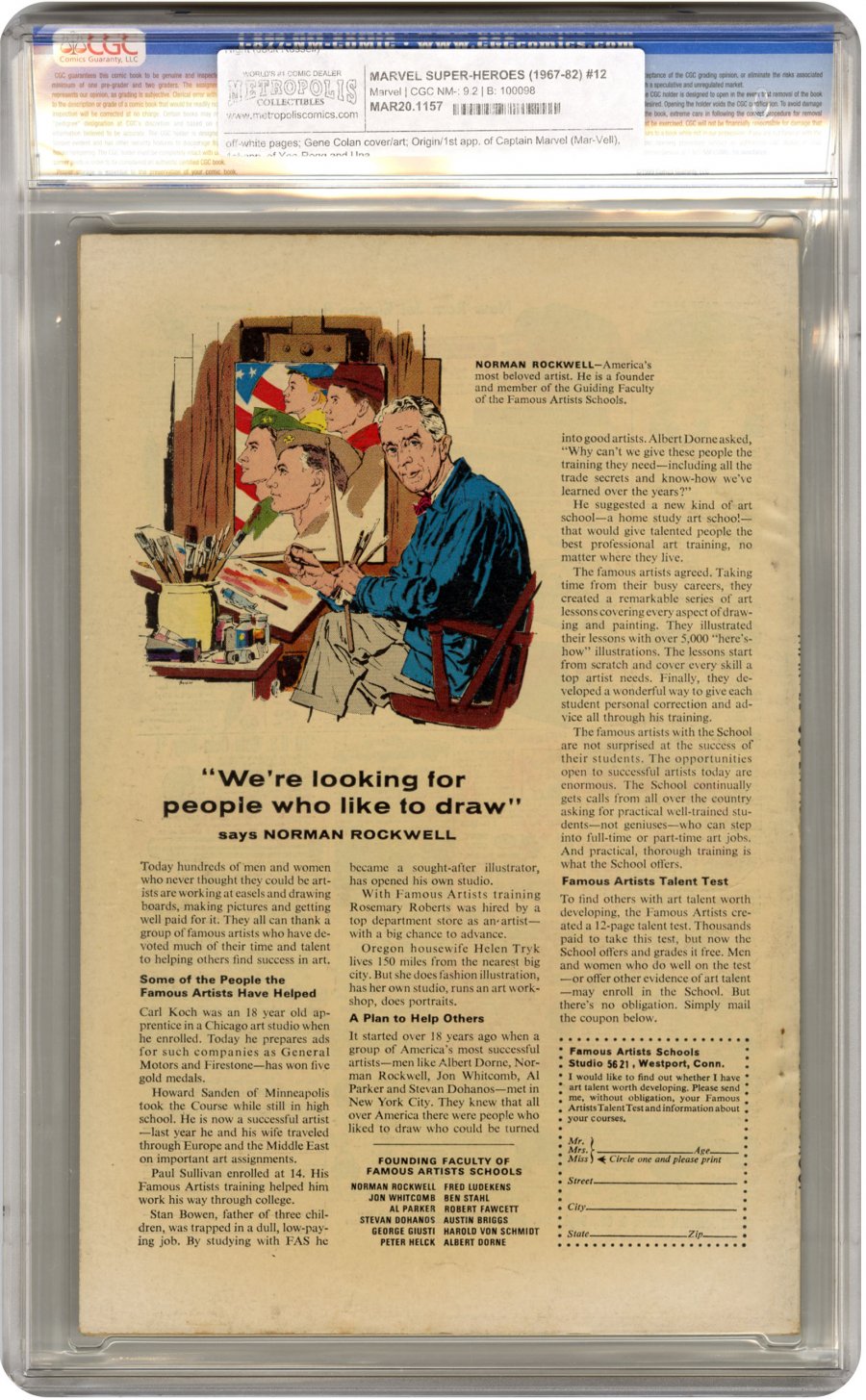 Marvel Super-Heroes #12 introduces us the first Captain Marvel of Marvel comics after Fawcett comics ceased the publication of their popular hero by the same name due to a lawsuit by DC. To Marvel it was essential to own the trademark on the name because of the connection to their own company, thus began a long battle outside of the books to keep the name in-house. In this premiere we meet Dr Walter Lawson aka Mar-Vell, a Kree science officer who travels to Earth to spy on humans for his home planet, after growing affectionate for earthlings aids them in several occasions against the Kree. Seeing his actions as treasonous, Mar-Vell was exiled from his home where he would go on to be a solo hero taking part in numerous cosmic adventures while also teaming up with other heroes against the Kree Empire and the Mad Titan, Thanos. Ironically the character didn't really catch on with readers until a graphic novel was released that told the story of his death. The publication featured heroes and villains from all over the Marvel Universe paying their respects, with even Thanos stating that Mar-Vell was his greatest adversary. Over the years the mantle of Captain Marvel was passed on to many characters as Marvel fiercely tried to keep the trademarked name under their control. Currently and possibly the most notable character to bear the title is Carol Danvers, formerly Ms. Marvel, who made her cinematic debut in 2019's “Captain Marvel.” Though the original Captain Marvel initially failed to grasp readers, the character eventually developed a cult following and became a hero whose legacy would have lasting ramifications in comics and movies to this day. With the current cinematic universe ramping up to feature more stories based on the Mar-Vell legacy, comic book investors and collectors expect the value of this book to increase dramatically in the next few years.