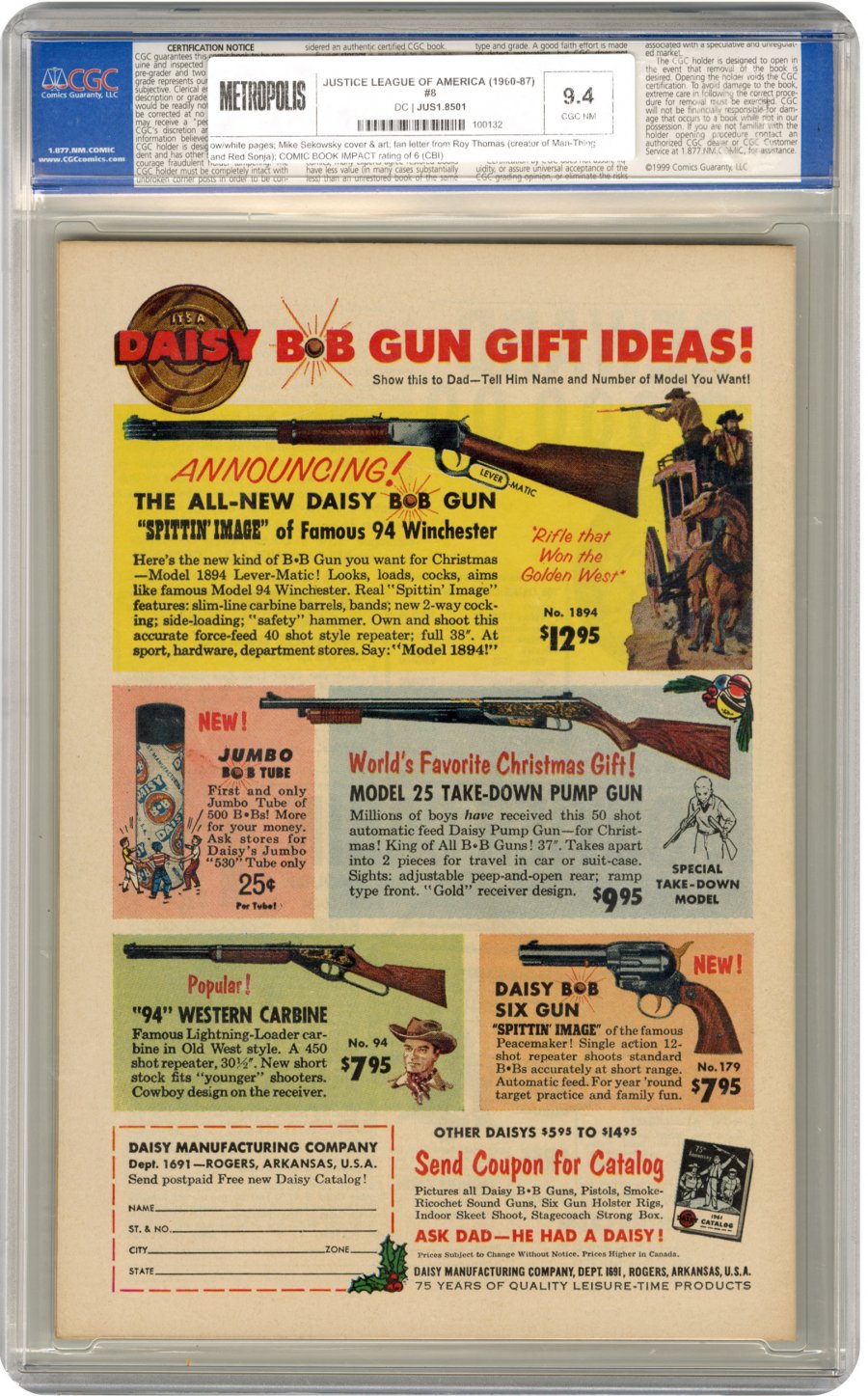 Cover pencils by Mike Sekowsky, inks by Murphy Anderson. For Sale--The Justice League!, script by Gardner Fox, pencils by Mike Sekowsky, inks by Bernard Sachs; While Superman and Batman are away in Dimension X, small-time gangster Pete Ricketts finds a strange ray that he uses to turn the Justice League into a gang of mind-controlled criminals that he auctions off to the highest bidder. fan letter from comics legend Roy Thomas (creator of Man-Thing and Red Sonja)