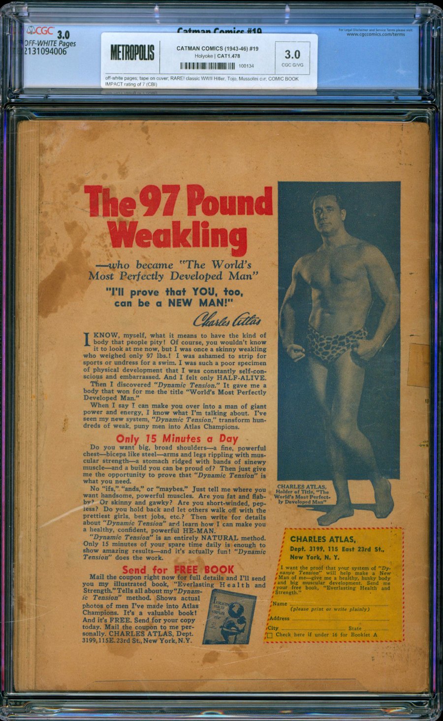 In recent years, WWII covers have grown in demand and popularity. The paper drives of the war effort, combined with the high numbers of copies going overseas to homesick soldiers and the limited print runs necessitated by the stunted economy make these some of the rarest of Golden Age comics, and the demand from both WWII collectors and comics aficianados means that surviving copies never fail to command top dollar in nearly any condition. Among the rarest of the rare is this star-spangled classic, from the already-scarce Catman series, one of the toughest of second-tier GA hero titles to collect. War collectors will note with pleasure that all three of the monstrous Axis leaders are caricatured in this powerful image, as Hitler, Tojo, and Mussolini prove no match for the Continental stable of heroes. While other WWII covers are better known or more celebrated, serious collectors know that this is among the scarcest of the bunch, and a rare treat to see on the marketplace.