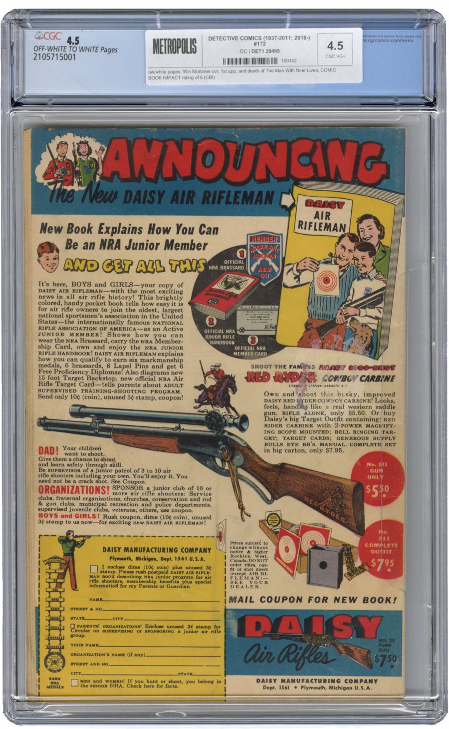 Win Mortimer cvr; 1st app. and death of The Man With Nine Lives; COMIC BOOK IMPACT rating of 6 (CBI)"The Outlaw Who Had Nine Lives" is Paul Gregorian, the man emerging from an inferno on the cover of Detective #172, he stymies the Dynamic Duo for a while with his apparent immortality, but once his gimmick is revealed (he's a magician) he ends up jumping to his death to avoid capture by Batman and Robin. This twist ending is a bit of shock, but in the freewheeling days before the CCA comic books walked the thin line between children's entertainment and adult themes with impunity. Just a short three years later this book would have been deemed unacceptable due to inappropriate content. This is a late Golden Age Detective issue that hearkens back to Batman's noir roots.