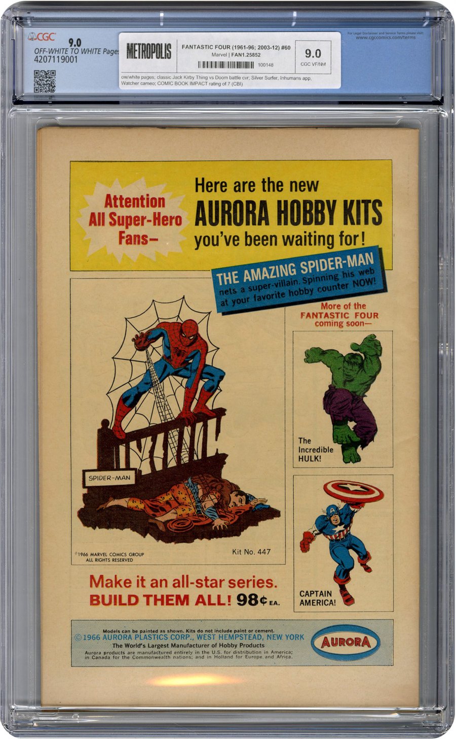 classic Jack Kirby Thing vs Doom battle cvr; Silver Surfer, Inhumans app, Watcher cameo; COMIC BOOK IMPACT rating of 7 (CBI)