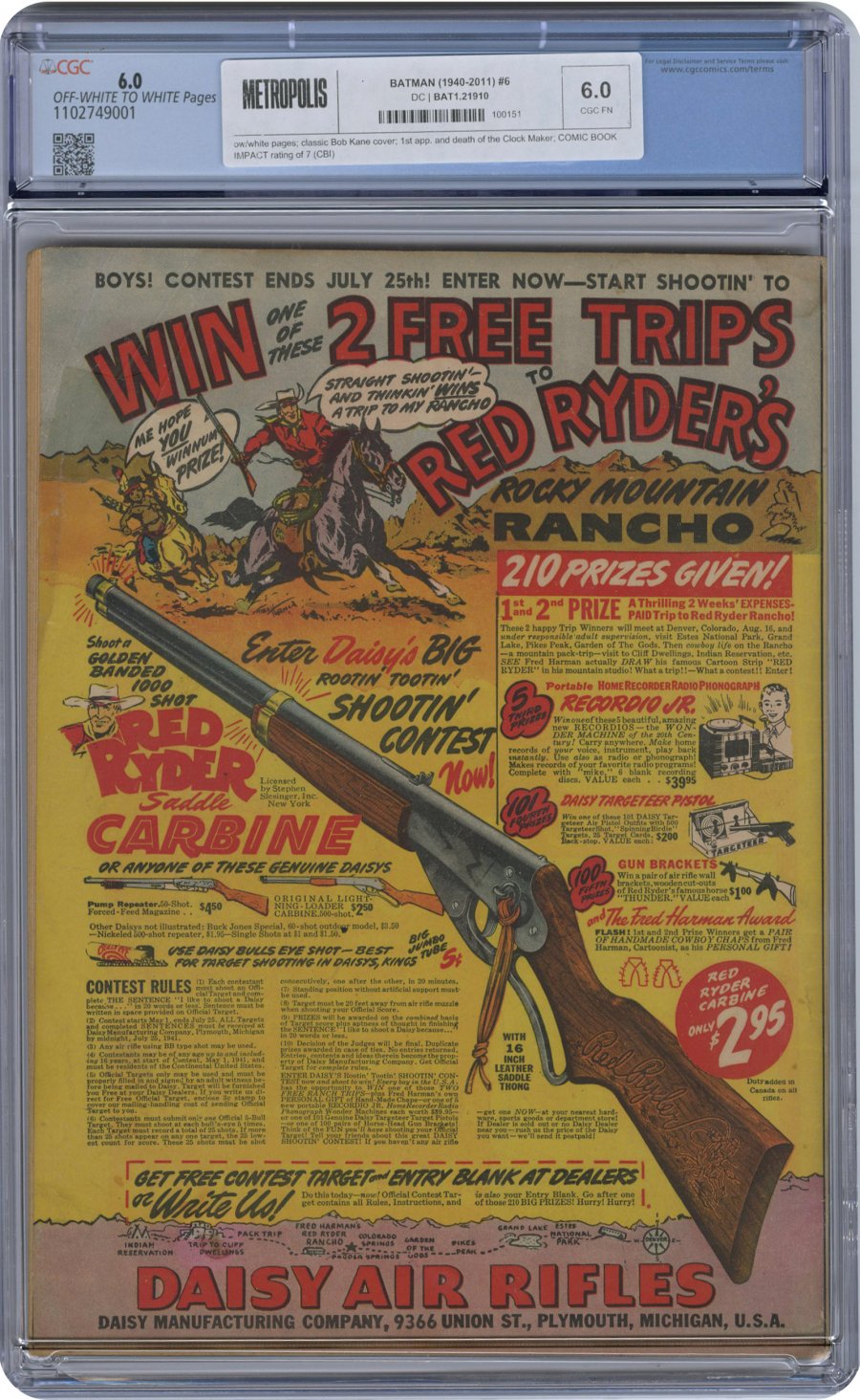 classic Bob Kane cover; 1st appearance and death of the Clock Maker; COMIC BOOK IMPACT rating of 7 (CBI)