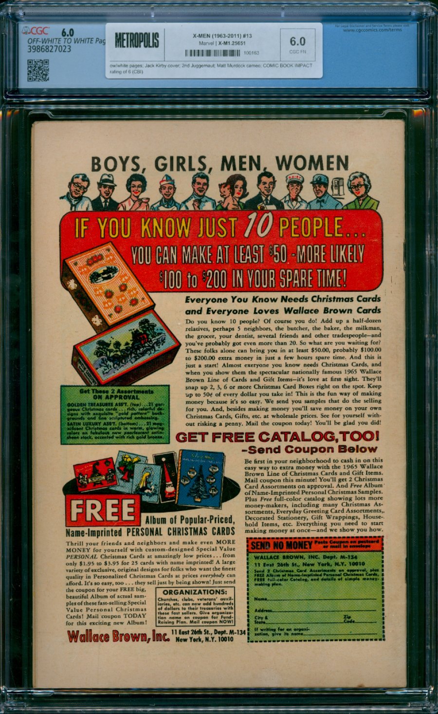Continuing the saga of the introduction of Charles Xavier's brother, the Juggernaut, this issue is basically a nonstop action-fest, an all-out melee between the X-Men and the brutal Juggernaut, whose helmet protects him from Professor X's mental powers. Calling on help from other heroes nearby, the Human Torch shows up in the nick of time to help the exhausted mutants, and they finally manage to subdue their enormous foe. Jean Grey tends to her battered and bruised compatriots after the battle, much to their pleasure. Featuring pencils by Kirby and Jay Gavin and inks by Joe Sinnott, this classic issue is a popular book with X-fans of all ages.