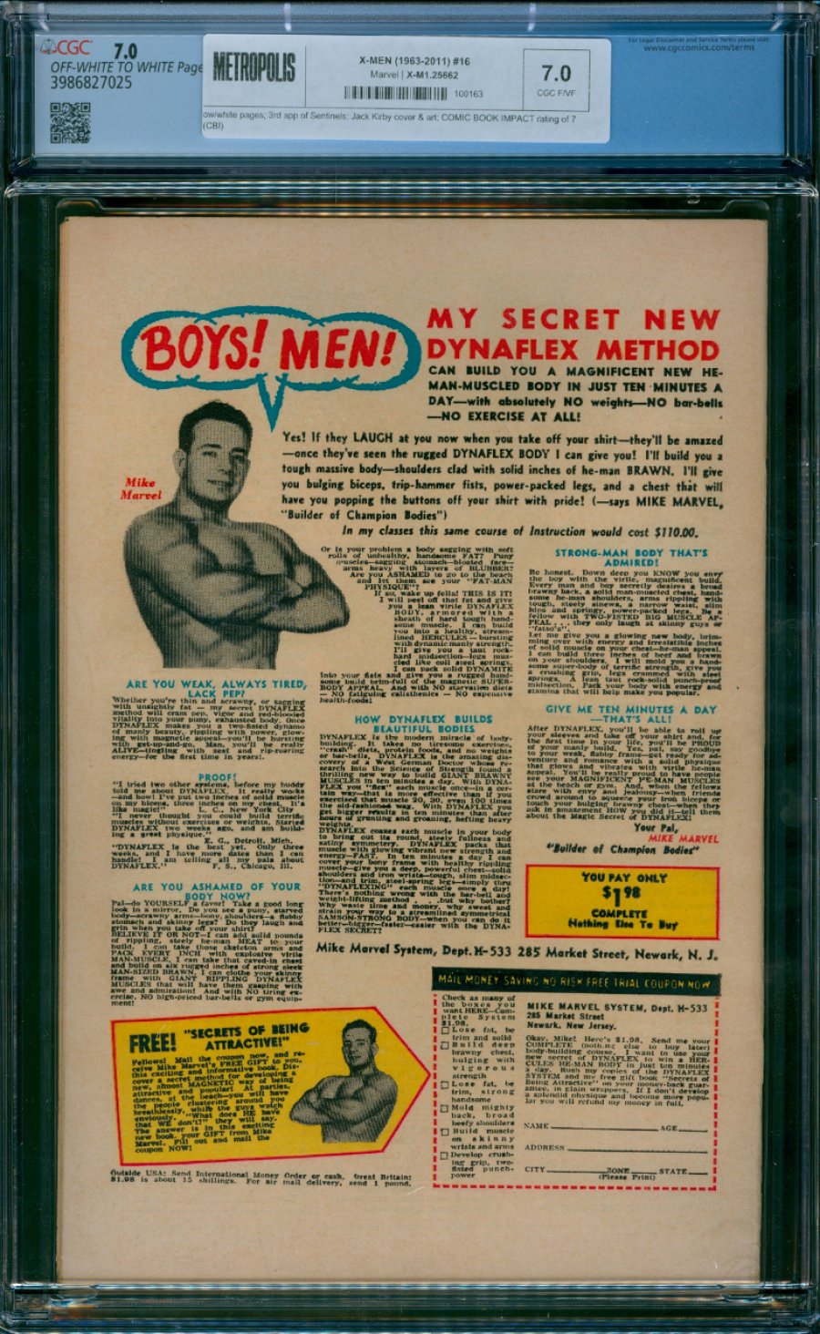 3rd app of Sentinels; Jack Kirby cover & art; COMIC BOOK IMPACT rating of 7 (CBI)Closing out the epic trilogy of the Sentinels, issue #16 of the X-Men finds our superheroes trapped by the robot threat while Professor X heads back to Manhattan to experiment on an abandoned Sentinel. Discovering their enemies' weakness, X heads back to help his team, who have, by now, been thwarted in an escape attempt. In the grand finale Bolviar Trask sacrifices himself in a lab explosion that brings down Master Mold and all of his minions, along with the Sentinel's lair. The X-Men return home, but their respite is destined to be brief. Jack Kirby, Jay Gavin, and Dick Ayers complete their impressive work on this final installation of an incredibly important storyline in X-Men lore.