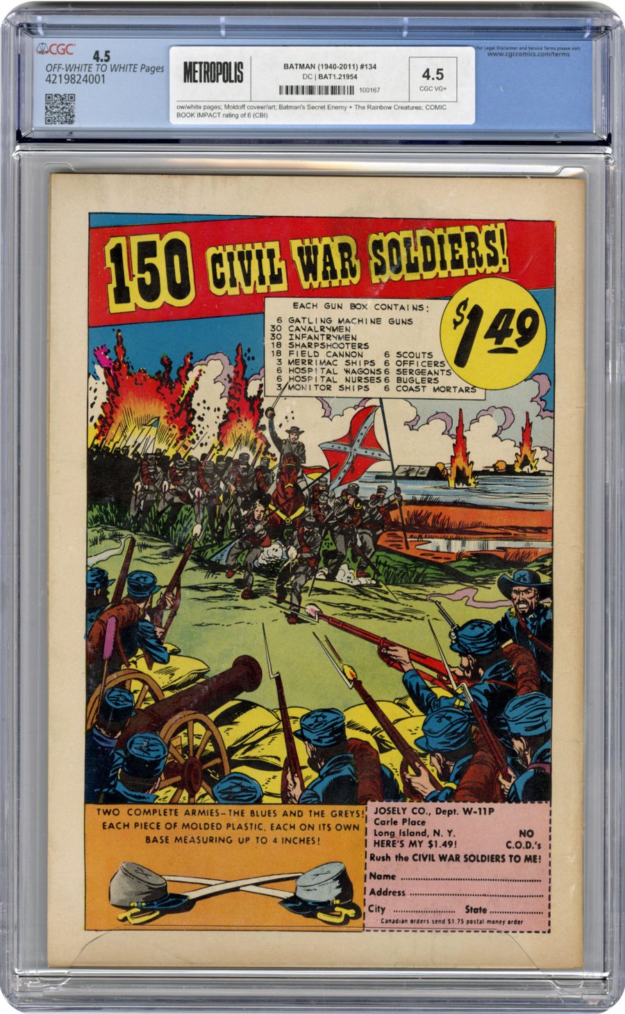 Moldoff cover/art; Batman's Secret Enemy + The Rainbow Creatures; COMIC BOOK IMPACT rating of 6 (CBI)"The Rainbow Creature," script by Bill Finger, art by Sheldon Moldoff; The Caped Crusaders, in South America to provide assistance to a leader, encounter a strange rainbow-colored creature that has emerged from a volcano. One-page Jail Jests story by Henry Boltinoff. Bike Safety = Bike Fun! public service announcement, art by Bernard Baily. "Batman's Secret Enemy," script by Bill Finger, art by Sheldon Moldoff; Bruce receives a very disturbing letter from someone, indicating that they know Batman's secret identity; The Caped Crusaders cature three crooks, believing any one of them may have written the letter. Half-page Casey the Cop story by Henry Boltinoff. "The Deadly Dummy," script by Bill Finger, pencils by Sheldon Moldoff, inks by Charles Paris;