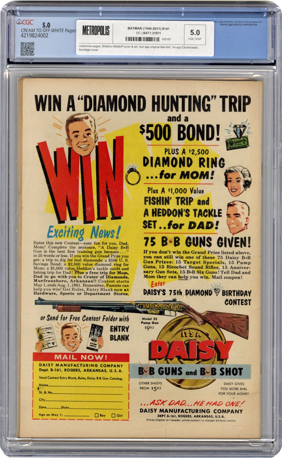 Sheldon Moldoff cover & art; 2nd app original Bat-Girl; 1st app Clockmaster; bondage coverThis issue features a campy-cool cover with Batwoman, Batgirl and of course, the Dynamic Duo. And the 1st app. of Clockmaster!