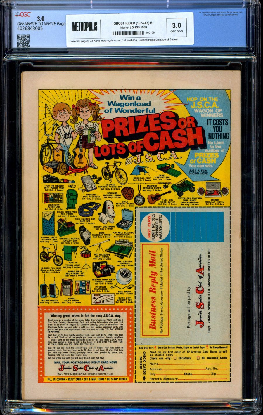 Ghost Rider's origins began in the Wild West, the original character was an eerie gunslinging horseback rider in his first iteration. Reimagined in the rough-and-tumble era of the 1970s as a motorcycle stuntman, no doubt influenced by the antics of Evel Knievel, Ghost Rider would become an instant cult success. The image of a rebel on a motorbike whose head is a flaming skull could simply not be denied, and the occult and supernatural trappings of his adventures appealed greatly to a public weaned on the grindhouse horrors of the era. This first issue of Ghost Rider capitalized on Johnny Blaze's success in the "try-out" anthology Marvel Spotlight which was spun off into this memorable and beloved series, spawning several reboots and motion pictures in the future.