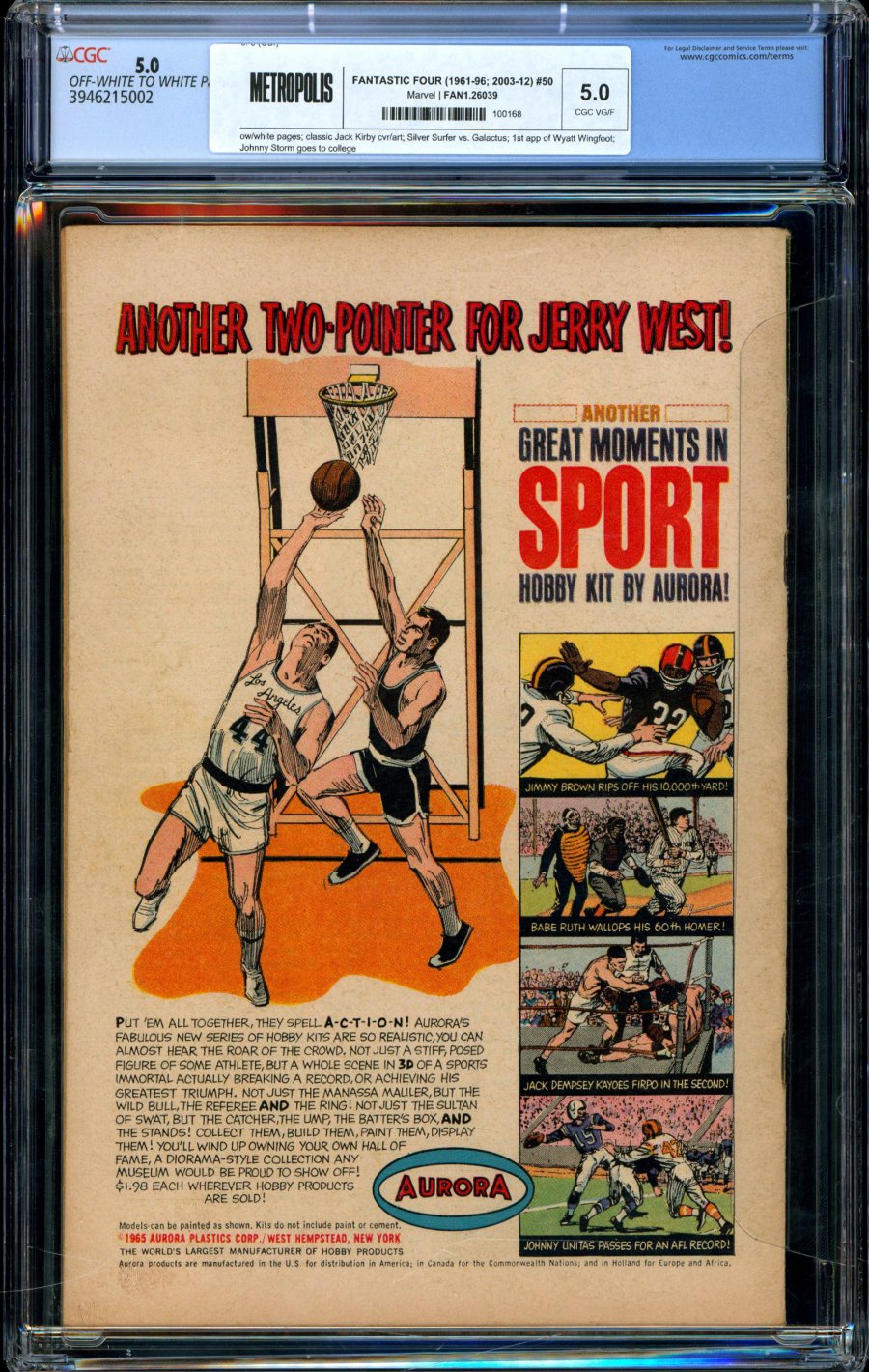 classic Jack Kirby cvr/art; Silver Surfer vs. Galactus; 1st app of Wyatt Wingfoot; Johnny Storm goes to collegeThe Surfer was famously dropped into his first appearance by Jack Kirby without warning his collaborator, Stan Lee, who was first bemused then intrigued by this bizarre and inventive new addition to the rapidly ballooning FF galaxy. By his third appearance in this landmark issue, Lee had solidified a tragic, Shakespearean arc for the new character, pitting him against his galactic master with the universe at stake and gracing him with tortured inner monologues and a questing spirit. The proof of the character's near-instantaneous acceptance with Marvel's increasingly college-aged readership is seen on this classic cover, where the upstart antagonist completely steals the focus from the book's supposed leads. Note the Thing's bewilderment at this unexpected turn of events.