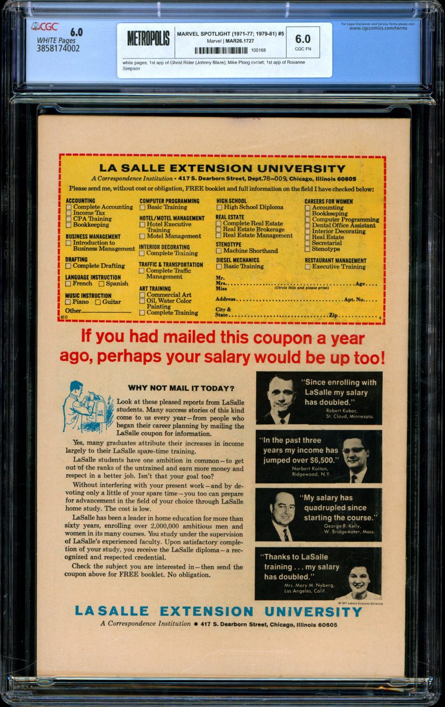 1st app of Ghost Rider (Johnny Blaze); Mike Ploog cvr/art; 1st app of Roxanne Simpson; COMIC BOOK IMPACT rating of 9 (CBI)
