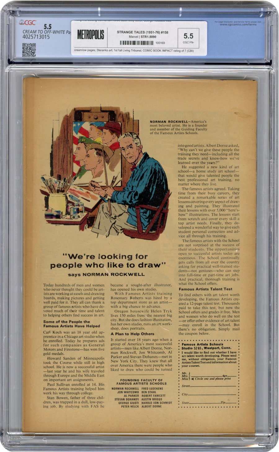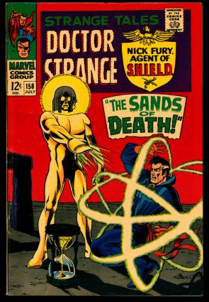 Steranko art; 1st full Living Tribunal; COMIC BOOK IMPACT rating of 7 (CBI)Cover pencils by Marie Severin. Nick Fury stars in "Final Encounter!" script and art by Jim Steranko; The battle between Fury & Strucker rages until Fury manages to remove his Satan glove; Minutes later, as HYDRA thugs enter the room, they discover 2 Strucker's! One of them is revealed to be wearing a mask, panics, and is incinerated in an Alpha-Particle Reactor Cube; The other orders Laura put aboard the Dyna-Soar and takes off from Hydra Island, despite the imminent detonation of The Death Spore bomb. "The Sands of Death," script by Roy Thomas and Marie Severin (co-plot), pencils by Marie Severin, inks by Herb Trimpe; The Living Tribunal decrees that because Doctor Strange has unleashed a menace to the cosmos Earth must be destroyed; Before he recites the Incantation of Oblivion he recounts events leading up to his decision, agreed upon by his 3 faces of Equity, Revenge & Necessity; Doctor Strange challenges the Tribunal to let him deal with the menace, having defeated the forces of darkness in the past. Strange is granted a reprieve for as long as it takes the Sands of Death to run out of a mystic Hourglass resting in the middle of Stonehenge; Cameos by Dormammu and Umar.