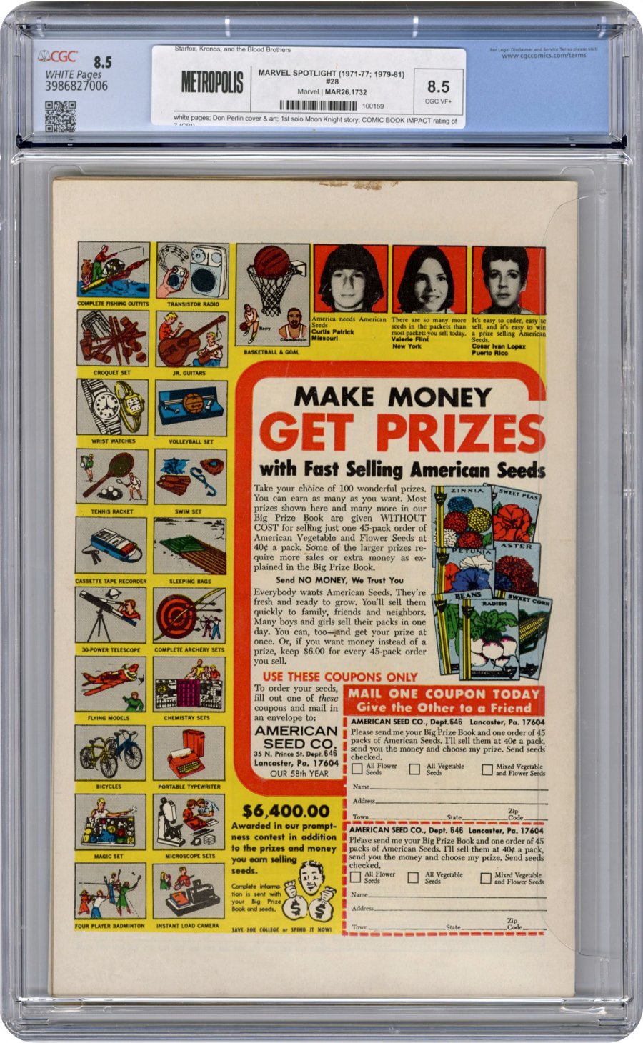 Don Perlin cover & art; 1st solo Moon Knight story; COMIC BOOK IMPACT rating of 7 (CBI)Marvel Spotlight #28, released in June 1976, is a pivotal issue in comic book history. It introduces the character Moon Knight, a complex and enigmatic superhero with a unique connection to the moon. Created by writer Doug Moench and artist Don Perlin, Moon Knight's debut marked a departure from conventional superhero tropes, offering readers a fresh and intriguing narrative.