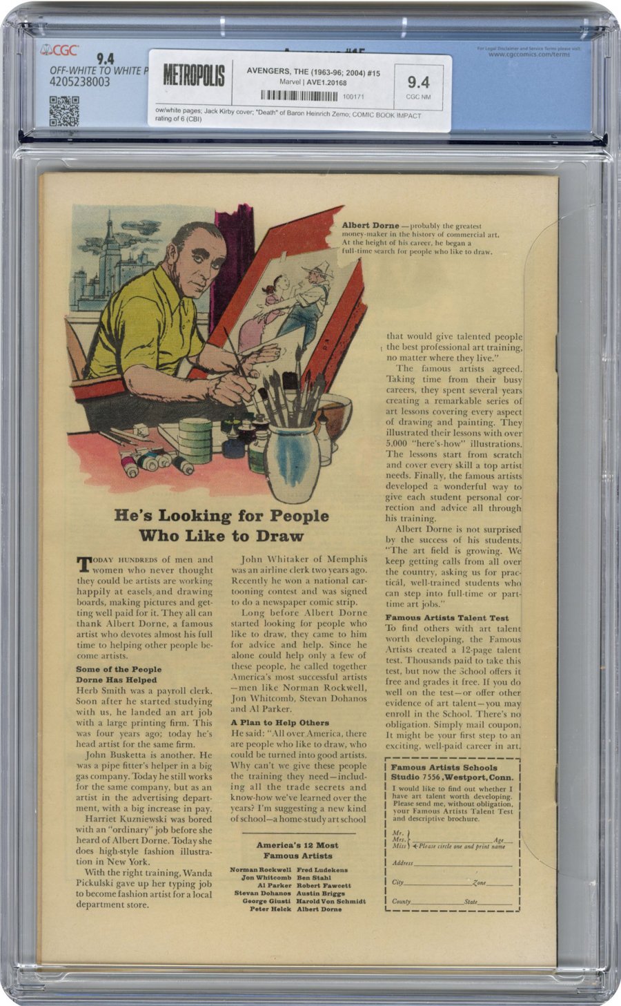 Jack Kirby cover; "Death" of Baron Heinrich Zemo; COMIC BOOK IMPACT rating of 6 (CBI)"Now, By My Hand, Shall Die a Villain!" Script by Stan Lee, layouts by Jack Kirby, pencils by Don Heck, inks by Mike Esposito (as Mickey Demeo). Avengers Roll Call: Thor, Captain America, Iron Man, Giant Man, Wasp, and Rick Jones. Villains: the first Baron Zemo, the Enchantress, the Executioner, the Melter, the second Black Knight, and the first appearance of Zemo's Mercenaries (Erik Josten). Baron Zemo is killed when a laser ray, he fires, reflects off of Captain America's shield and causes an avalanche that buries the baron underneath a ton of rock.