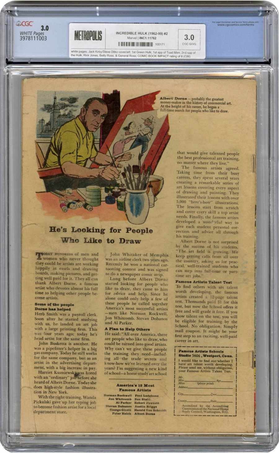 1st appearance of Hulk (Green Hulk); 1st app. of Toad Men; 2nd app of the Hulk, Rick Jones, Betty Ross, & General Ross; Jack Kirby/Steve Ditko cover/art; COMIC BOOK IMPACT rating of 8 (CBI)