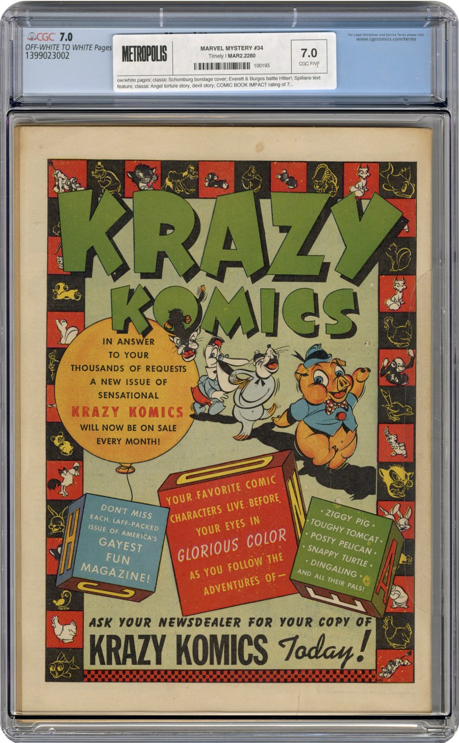 classic Schomburg bondage cover; Everett & Burgos battle Hitler!; Spillane text feature, classic Angel torture story, devil story; COMIC BOOK IMPACT rating of 7 (CBI)