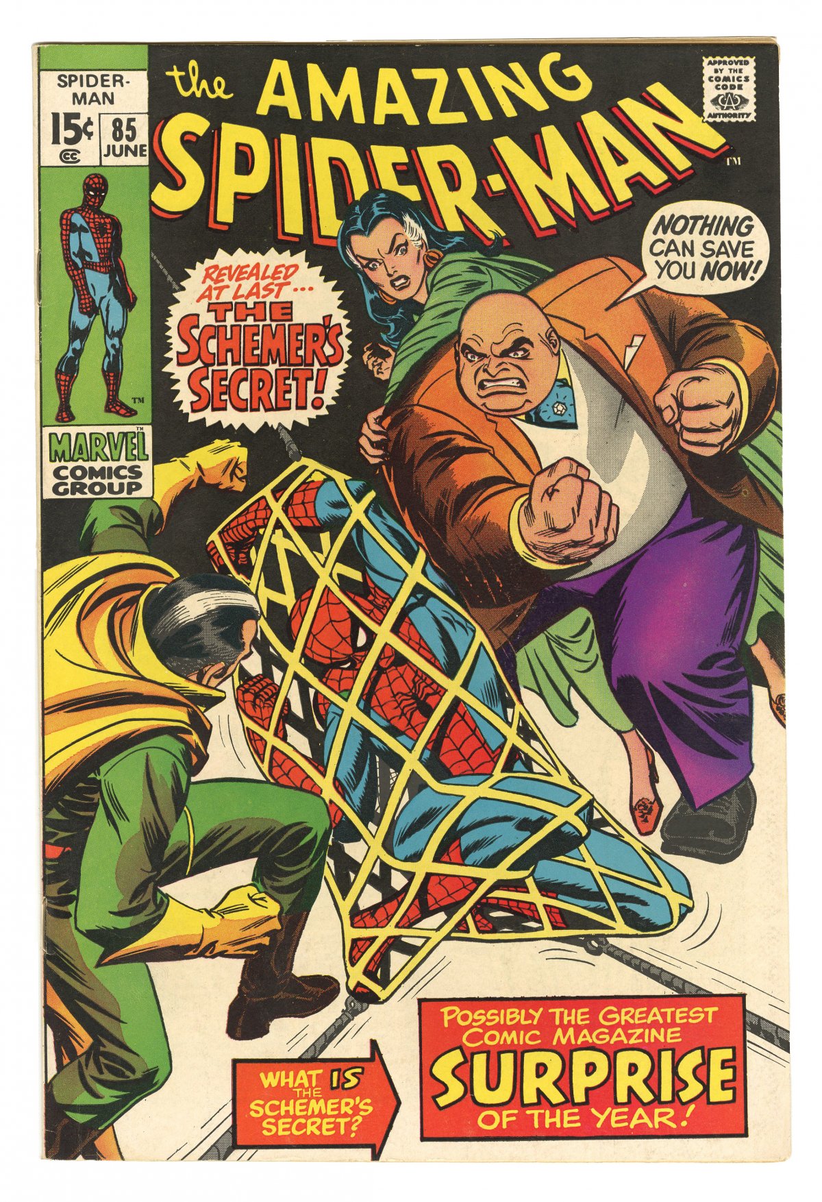 Kingpin app. (6/70) COMIC BOOK IMPACT rating of 6 (CBI)Cover art by John Romita. The Secret of the Schemer!, script by Stan Lee, pencils by John Romita (layouts) and John Buscema, inks by Jim Mooney; Peter pulls a double switch to keep Captain Stacy and Gwendy from identifying him as Spider-Man; Spidey tracks down the Schemer but they both fall into the Kingpin's trap; The ensuing battle comes to an abrupt end when the Schemer is revealed to be Richard Fisk, the Kingpin's long lost son.