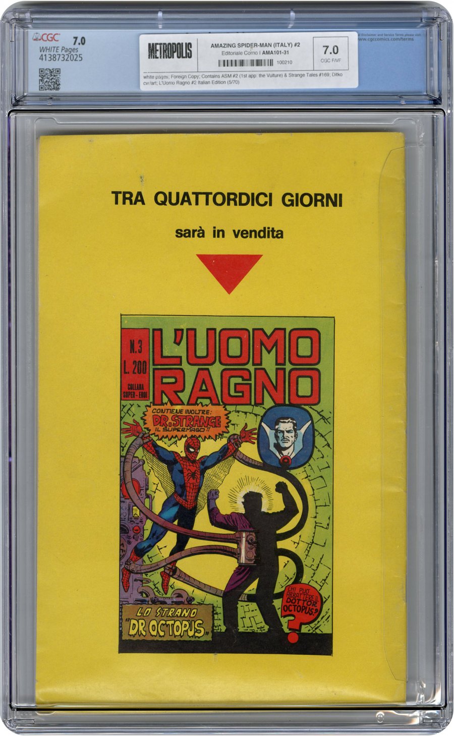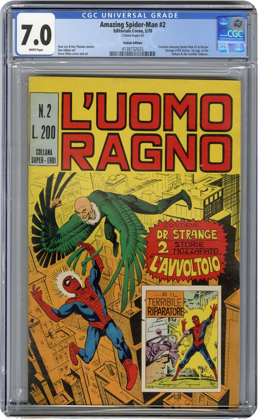 L'Uomo Ragno #2 Italian Edition (5/70). Contains ASM #2 (1st app: the Vulture) & Strange Tales #169; Ditko cvr/art;