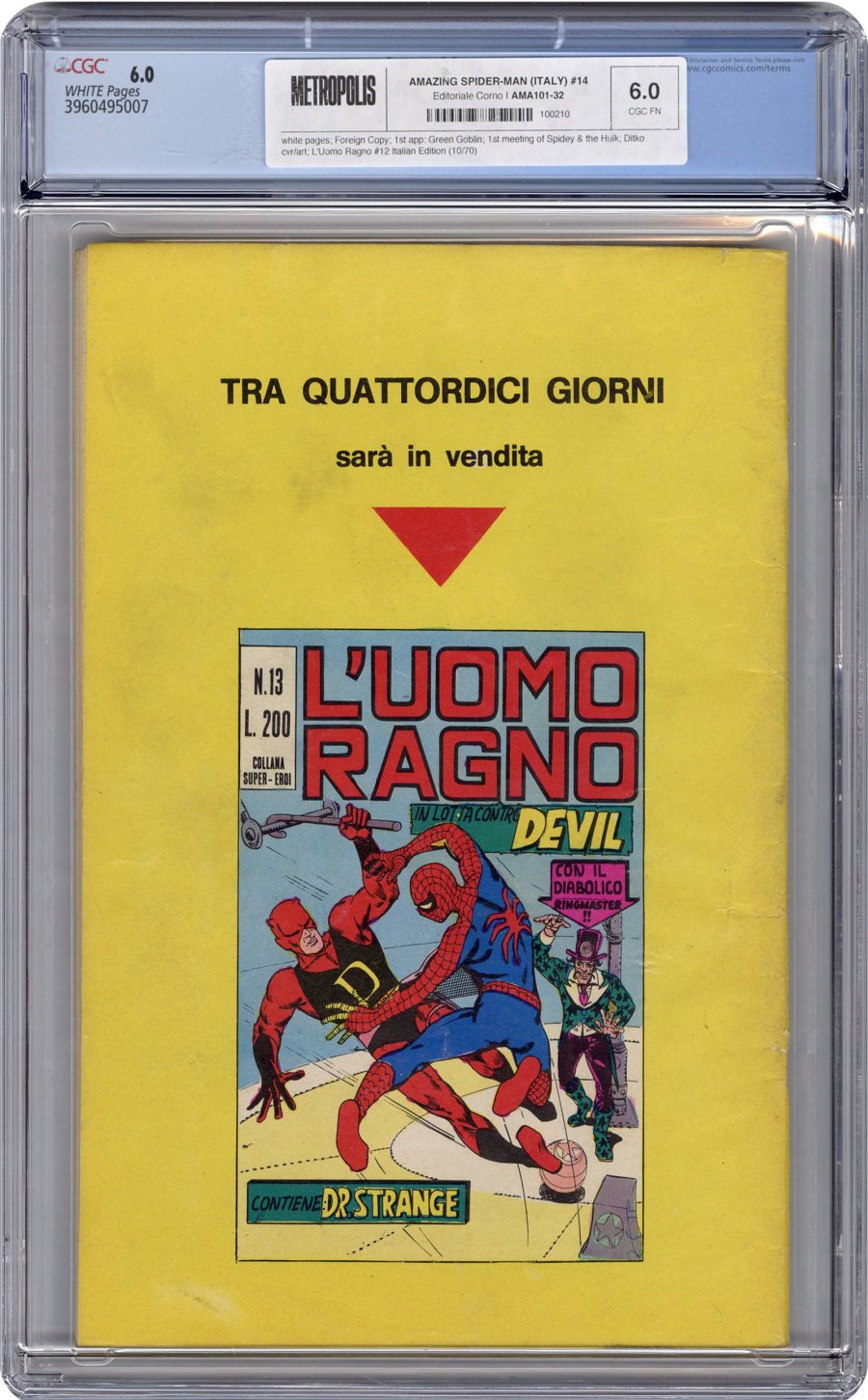 1st app: Green Goblin; 1st meeting of Spidey & the Hulk; Ditko cvr/art; L'Uomo Ragno #12 Italian Edition (10/70)