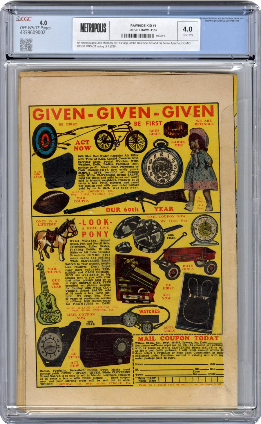 Joe Maneely cvr; 1st app. of the Rawhide Kid and his horse Apache; COMIC BOOK IMPACT rating of 7 (CBI)Wyatt Earp app.