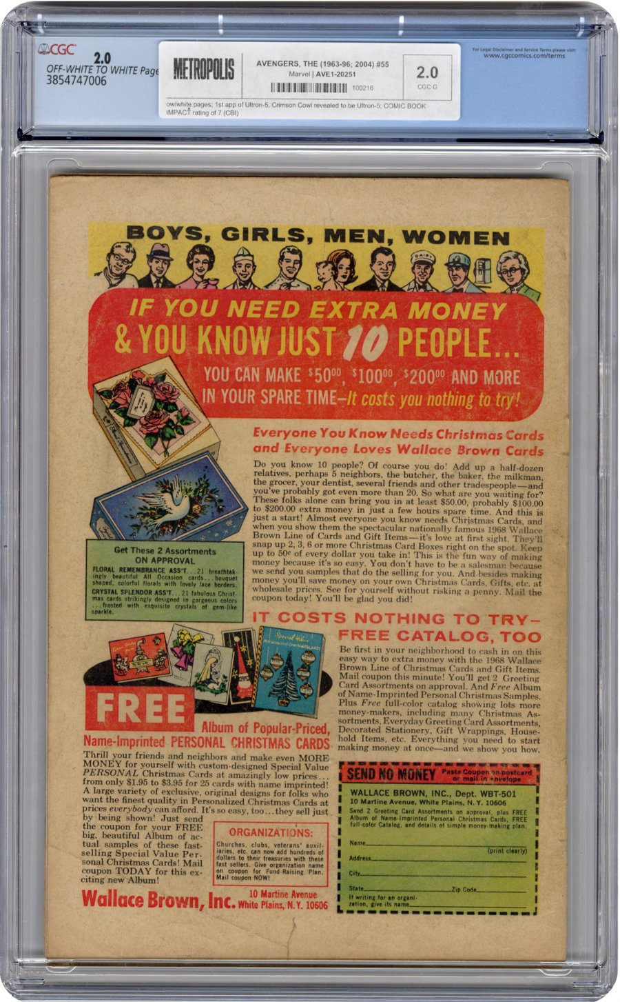 1st app of Ultron-5, Crimson Cowl revealed to be Ultron-5; COMIC BOOK IMPACT rating of 7 (CBI)"Mayhem Over Manhattan" indeed, this thrilling cover piece by John Buscema shows the Avengers doing battle with the The Masters of Evil, a team of villains comprised of Klaw, the Radioactive Man, Whirlwind, the Melter, and one Crimson Cowl, who is actually Ultron-5 in disguise. Yes friends, this is the comic book which features the first (full) appearance of the evil robot that would inspire the box office blockbuster Avengers: Age of Ultron, which is worth the price of admission alone, but wait, there's more, Hawkeye, Goliath, Black Panther, and the Wasp are all in on the action as well as a guest appearance by the Black Knight, who will probably have his own movie or TV series at some point...this is a "must-have" book for Avenger fans.