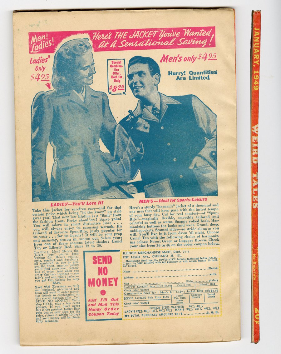 Jan 1949. Cover by Lee Brown Coye. Horror and supernatural stories by Allison Harding "Four From Jehlam", Robert Heinlein "Our Fair City", E. Everett Jones, Frank Gruber, Snowden T. Herrick, John MacDonald "The Great Stone Death", Harold Lawlor.