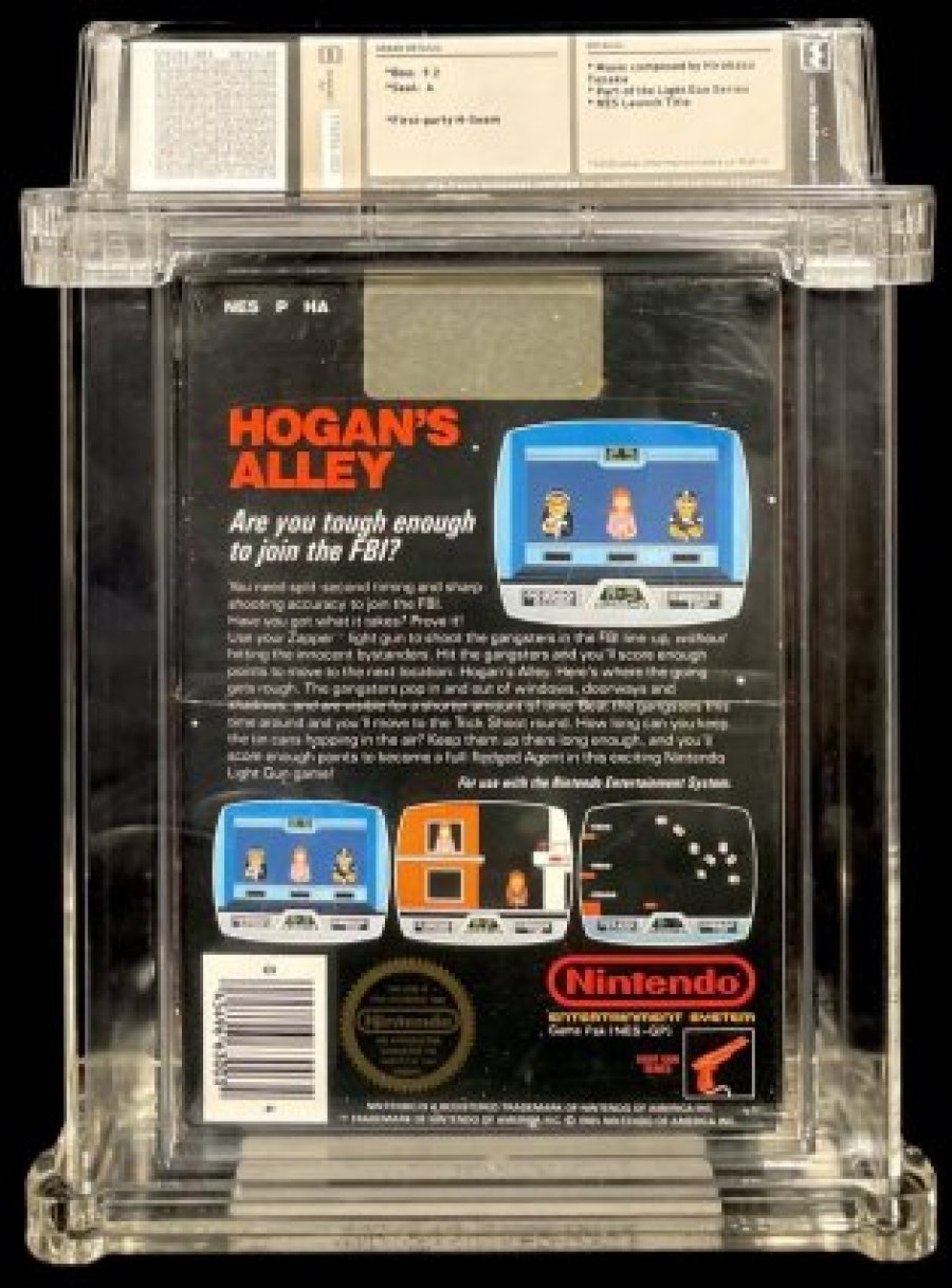 Music composed by Hirokazu Tanaka; Part of the Light Gun Series; NES Launch Title.Are you tough enough to join the FBI? You need split second timing and sharp shooting accuracy to join the FBI. have you got what it takes? Prove it! Use your Zapper light gun to shoot the gangsters in the FBI line up, without hitting the innocent bystanders. Hit the gangsters and you'll score enough points to move to the next location: Hogan's Alley. Here's where the going gets rough. The gangsters pop in and out of windows, doorways and shadows, and are visible for a shorter amount of time.