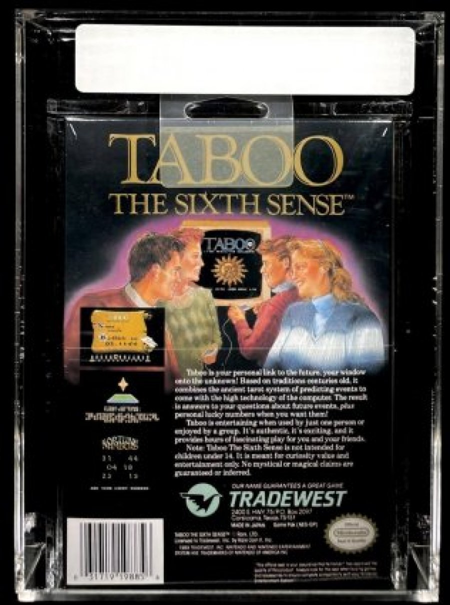 Music composed by David Wise; Designed by Julian Jameson; Marketed as a party game for adultsTaboo is your personal link to the future, your window onto the unknown! Based on traditions centuries old, it combines the ancient tarot system of predicting events to come with the high technology of the computer. The results is answer to your questions about future events, plus personal lucky numbers when you want them! Taboo is entertaining when used by just one person or enjoyed by a group. It's authentic, it's exciting, and it provides hours of fascinating play for you and your friends. Note: Taboo The Sixth Sense is not intended for children under 14. It is meant for curiosity value and entertainment only. No mystical or magical claims are guaranteed or inferred.