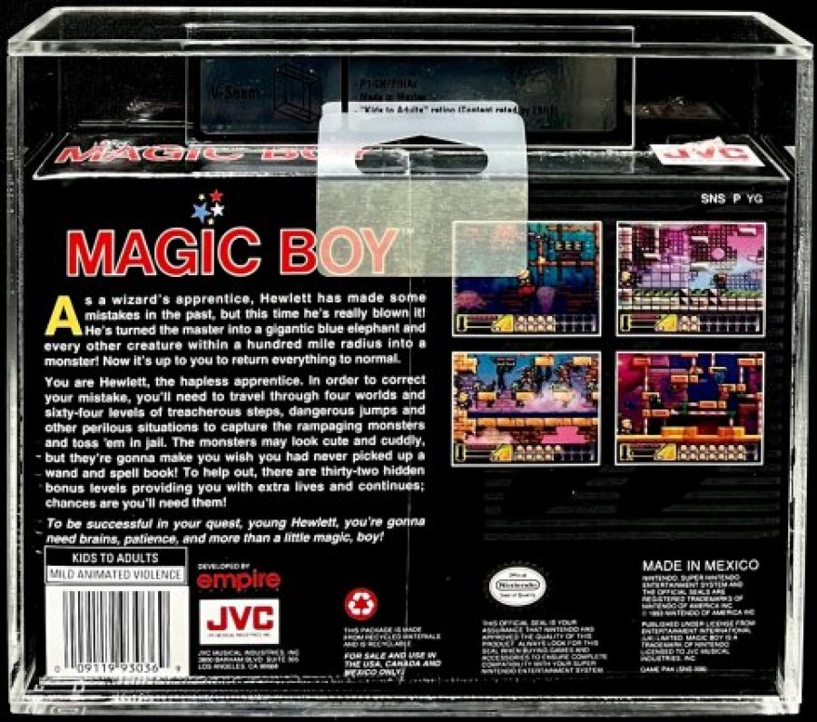 Designed & composed by John Dale; Port of the 1993 multi-platform computer game; Developed by Empire SoftwareAs a wizard's apprentice, Hewlett has made some mistakes in the past, but this time he's really blown it! He's turned the master into a gigantic blue elephant and every other creature within a hundred mile radius into a monster! Now it's up to you to return everything to normal. You are Hewlett, the hapless apprentice. In order to correct your mistake, you'll need to travel through four worlds and sixty-four levels of treacherous steps, dangerous jumps and other perilous situations to capture the rampaging monsters and toss 'em in jail. The monsters may look cute and cuddly, but they're gonna make you wish you had never picked up a wand and spell book! To help out, there are thirty-two hidden bonus levels providing you with extra lives and continues; chances are you'll need them! To be successful in your quest, young Hewlett, you're gonna need brains, patience, and more than a little magic, boy!