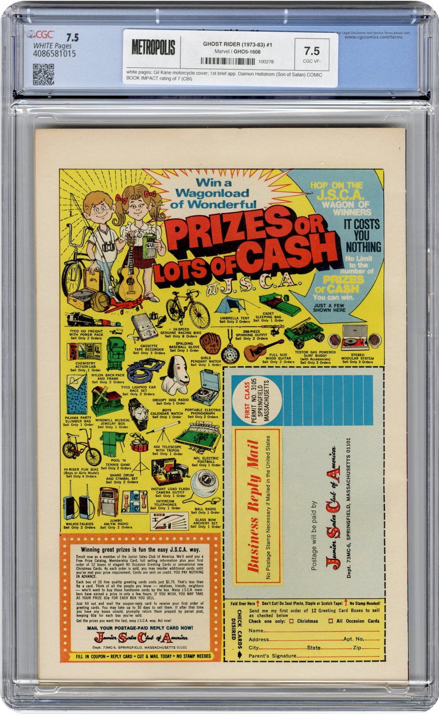 Ghost Rider's origins began in the Wild West, the original character was an eerie gunslinging horseback rider in his first iteration. Reimagined in the rough-and-tumble era of the 1970s as a motorcycle stuntman, no doubt influenced by the antics of Evel Knievel, Ghost Rider would become an instant cult success. The image of a rebel on a motorbike whose head is a flaming skull could simply not be denied, and the occult and supernatural trappings of his adventures appealed greatly to a public weaned on the grindhouse horrors of the era. This first issue of Ghost Rider capitalized on Johnny Blaze's success in the "try-out" anthology Marvel Spotlight which was spun off into this memorable and beloved series, spawning several reboots and motion pictures in the future.