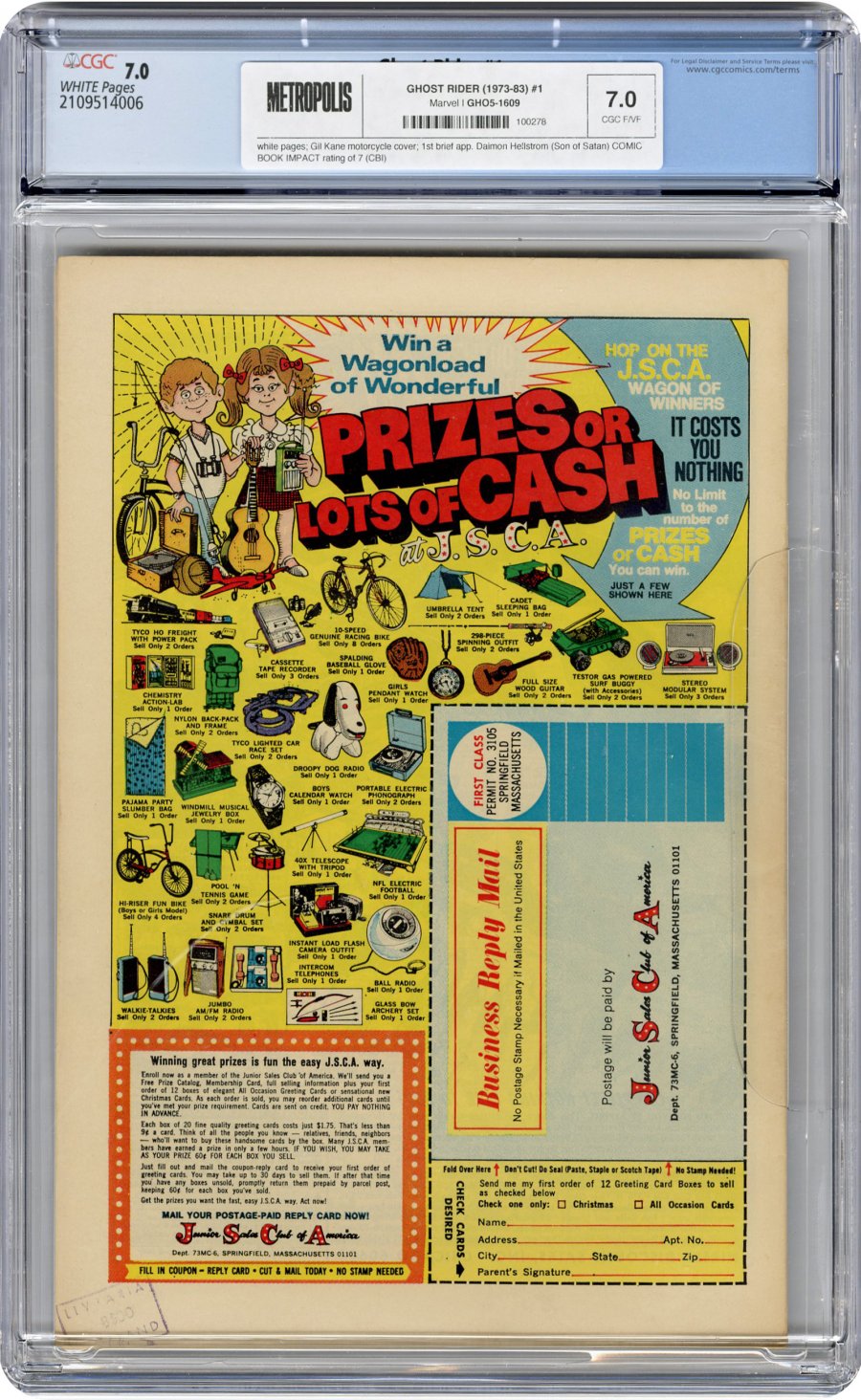 Ghost Rider's origins began in the Wild West, the original character was an eerie gunslinging horseback rider in his first iteration. Reimagined in the rough-and-tumble era of the 1970s as a motorcycle stuntman, no doubt influenced by the antics of Evel Knievel, Ghost Rider would become an instant cult success. The image of a rebel on a motorbike whose head is a flaming skull could simply not be denied, and the occult and supernatural trappings of his adventures appealed greatly to a public weaned on the grindhouse horrors of the era. This first issue of Ghost Rider capitalized on Johnny Blaze's success in the "try-out" anthology Marvel Spotlight which was spun off into this memorable and beloved series, spawning several reboots and motion pictures in the future.