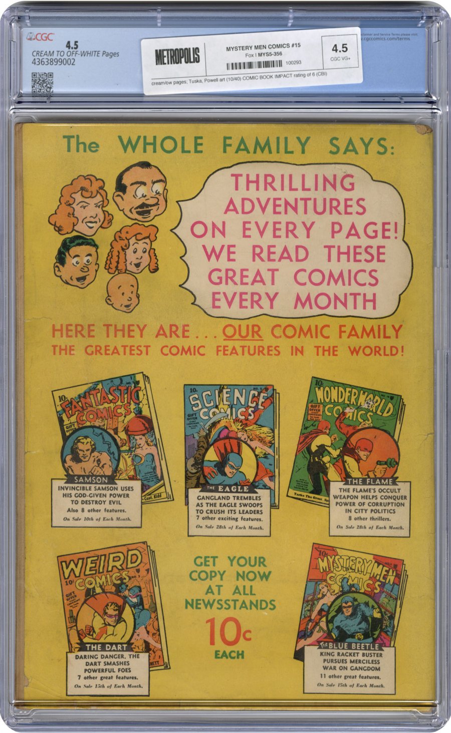 Mystery Men Comics #15 features none other than the Blue Beetle on the cover, a superhero who has led a labyrinthine path through the industry, moving from publisher to publisher, only to end up featured in a big-budget Hollywood production in the modern day. This Golden Age anthology book features contributions from Bob Powell, Dick Briefer, and Fred Schwab, all names familiar to fans of comics of the period. There's also the famously fictional Kooba Cola brand hawked on this comic's cover, adding to the allure and overall desirability of this classic collectible.