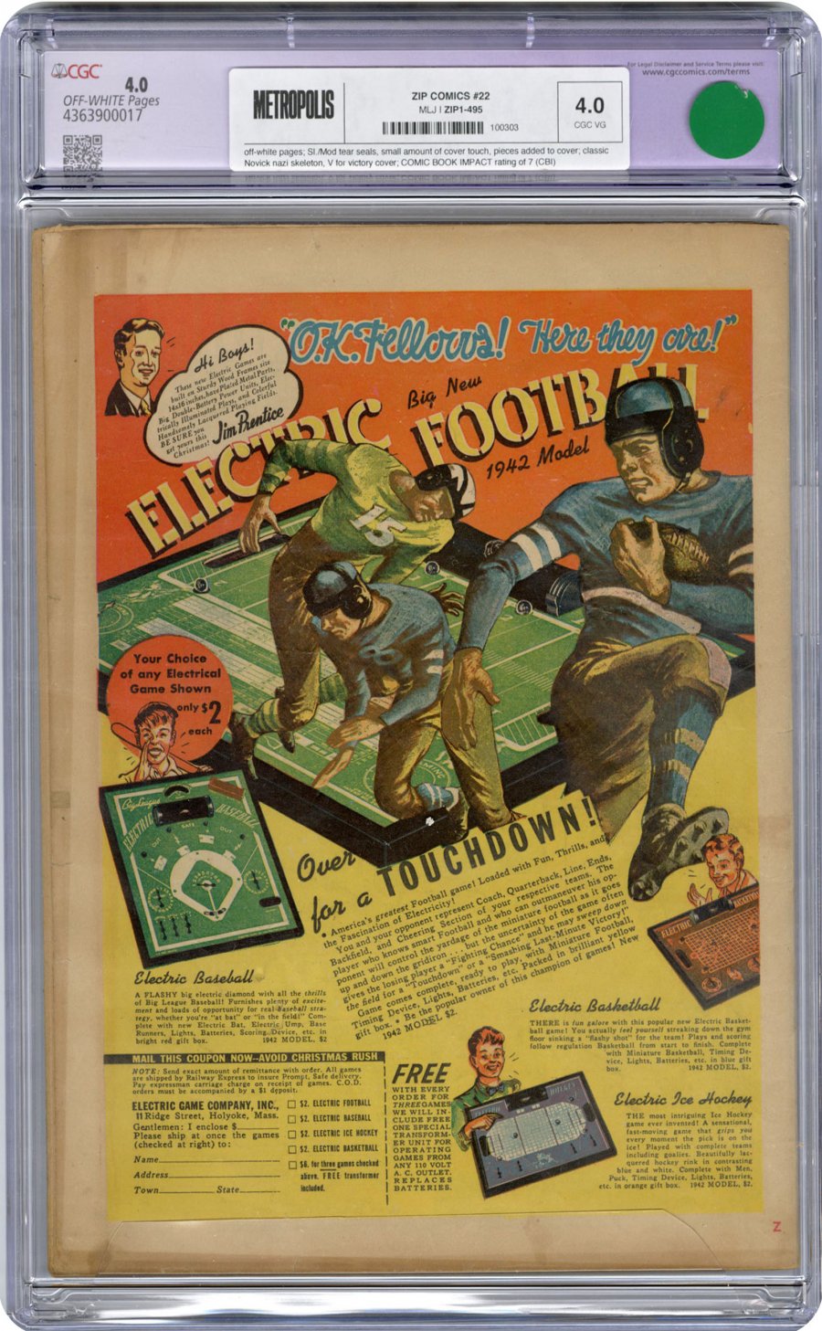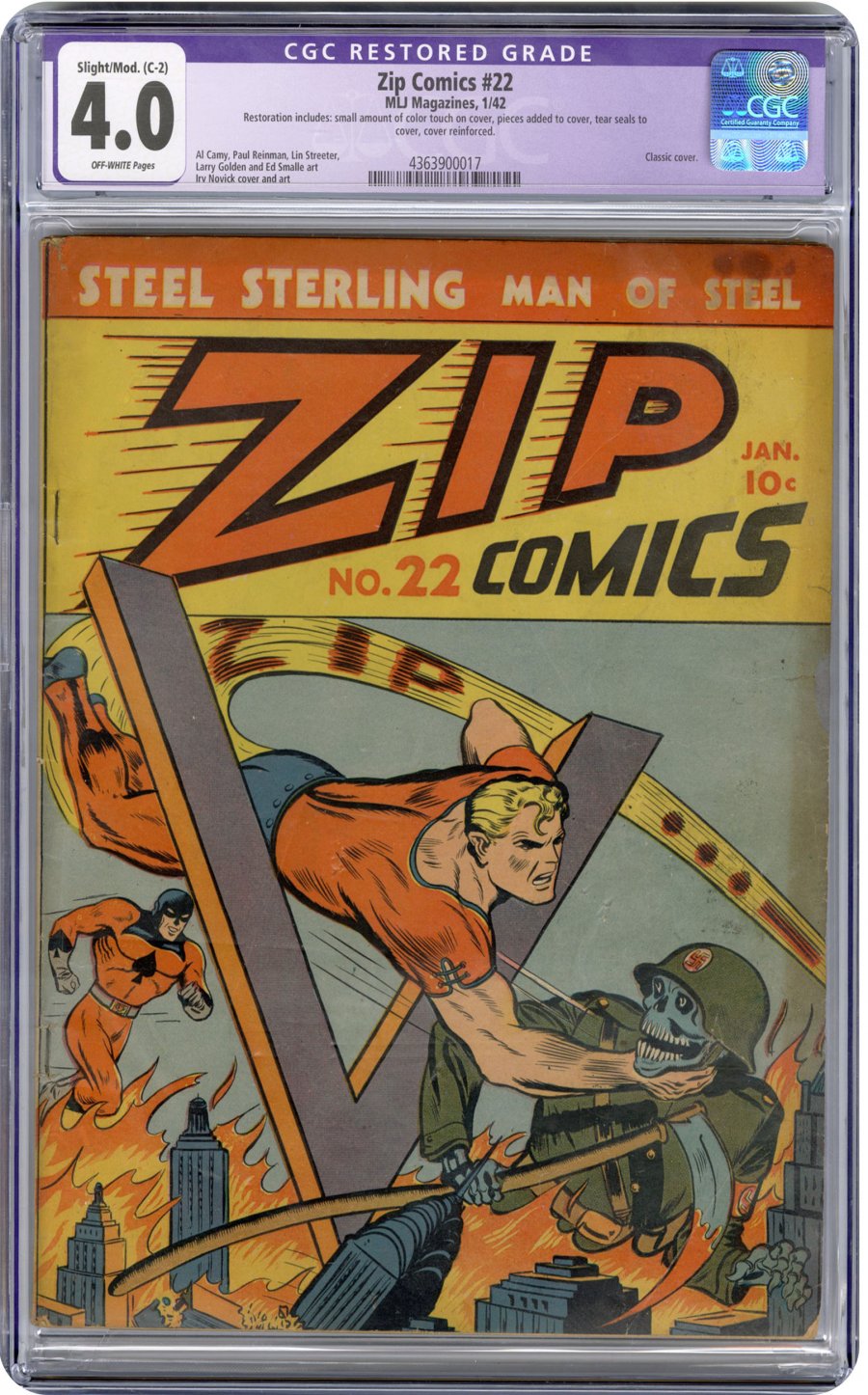 classic Novick nazi skeleton, V for victory cover; COMIC BOOK IMPACT rating of 7 (CBI)This classic cover for Zip Comics #22 captures the freedom and imagination that inspired comic artists trying to capture the American fighting spirit during the international conflict. This issue also offers one of the first Nazi Zombie stories ever published, as Steel Sterling travels to Hawaii and faces the evil Professor Dazzero.