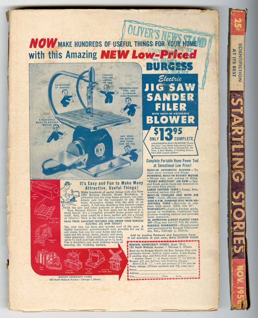 July 1949. Cover by Earle K. Bergey. Stories by George O. Smith, Henry Kuttner, Margaret St. Clair, Arthur C. Clarke, Ray Bradbury, L. Ron Hubbard (under the pseudonym Rene LaFayette), and C.M. Kornbluth. Two Virgil Finlay illustrations.