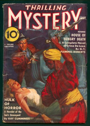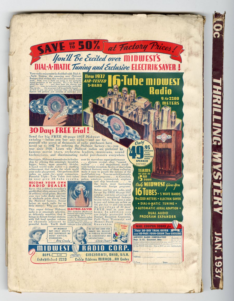 January 1937. classic bondage cover. "The Dead Stand Guard" by G.T. Fleming-Roberts. "Merchants of Damnation" by John H. Knox. "Terror in the House" by Henry Kuttner. "The Everglades Horror" by Hugh B. Cave.