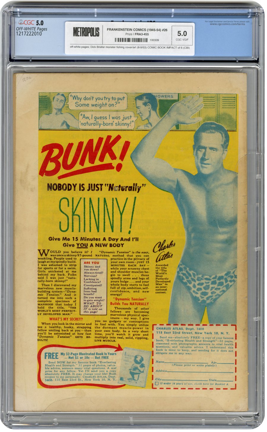Dick Briefer monster fishing cover/art (8-9/53) COMIC BOOK IMPACT of 6 (CBI)Stories and art by Dick Briefer and Marvin Stein. Cover by Dick Briefer. Prize Comics revives Dick Briefer's Frankenstein series in line with the horror trends of the Pre-Code 1950s. The Monster gets caught up in a mad whaler's obsessive search for his prey. Mortimer Nash is compelled to kill whenever he sees the moon. A crook meets a strange little man who offers to grant wishes...for a price. The Battle of the Monsters; Haunted Car; Moon Madness; Polio Facts for 1953; Four Wishes.